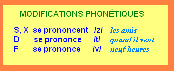 La liaison es la unión obligatoria, en la pronunciación, entre la última consonante de una palabra y la vocal inicial de la palabra que la sigue. Hay liaisons obligatorias y otras que no se pueden hacer. Y algunas modificaciones fonéticas.